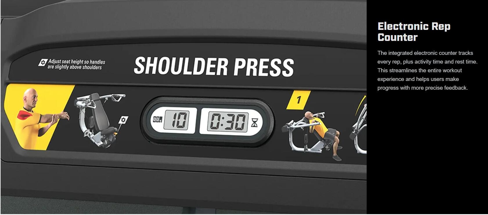 The Ultra Converging Shoulder Press provides a powerfully comfortable solution for building and toning deltoids. Independent converging movements provide a natural path of motion. Dual-position hand grips allow for greater training variety, and counterbalanced pressing arms provide reduced starting resistance. It even includes a reclined seat position to encourage better posture and provide back support.